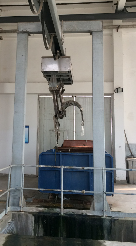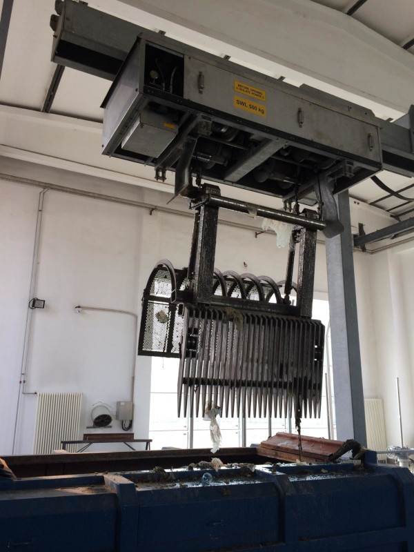 Die Zähne des Greifers greifen in den Spaltrost ein, so dass eine vollständige Reinigung erreicht wird. Der Greifer wird über ein Seil abgelassen und angehoben. Das Öffnen und Schließen des Greifers erfolgt durch Hydraulikzylinder.